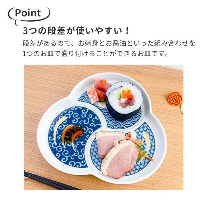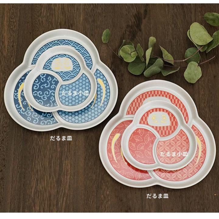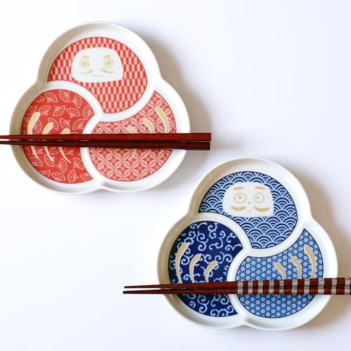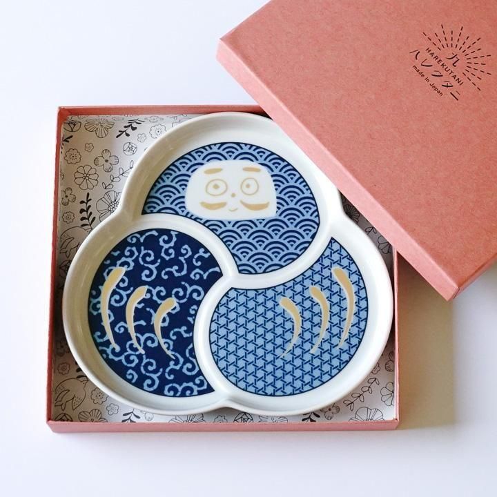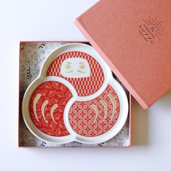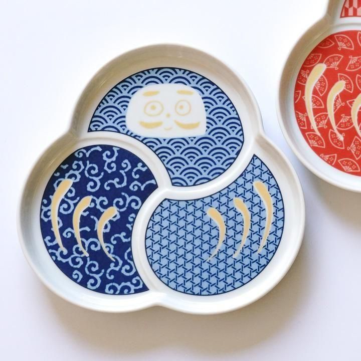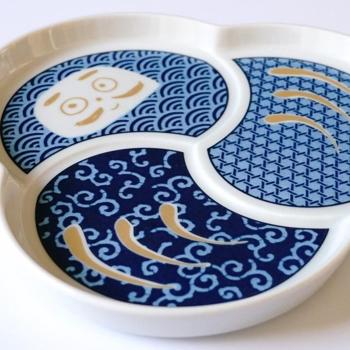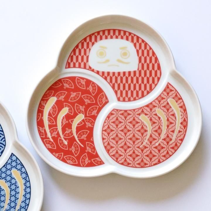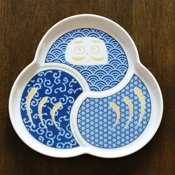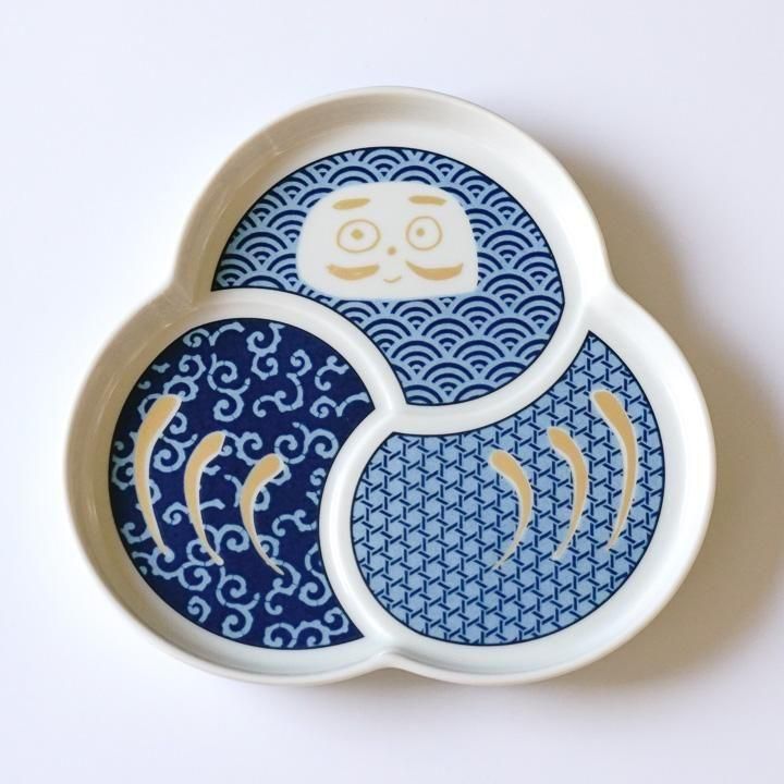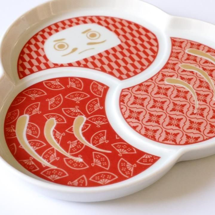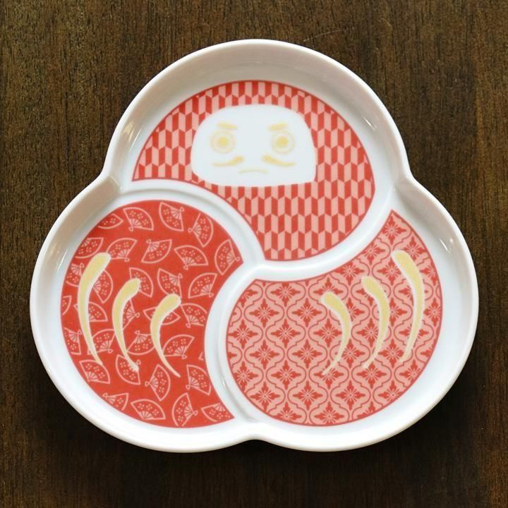 3つの円を組み合わせたようなプレートです。 だるまは金彩で描かれていて、福々しさ満点。