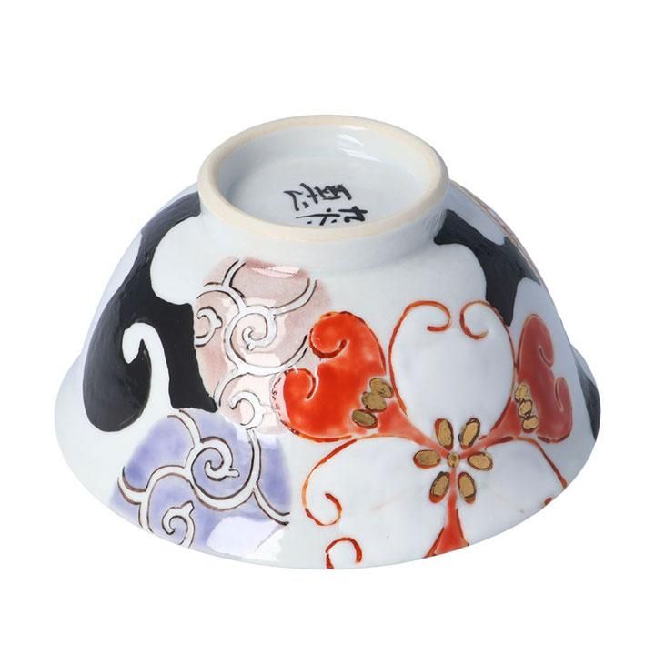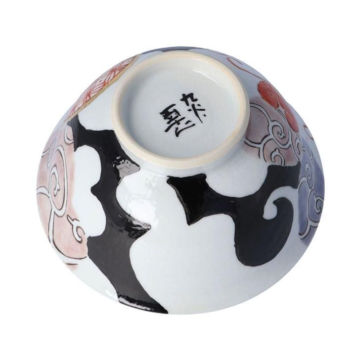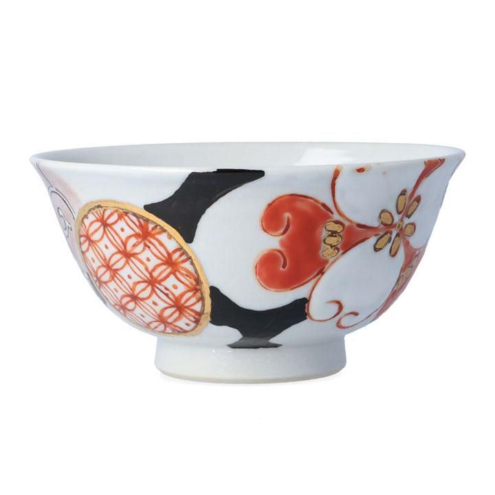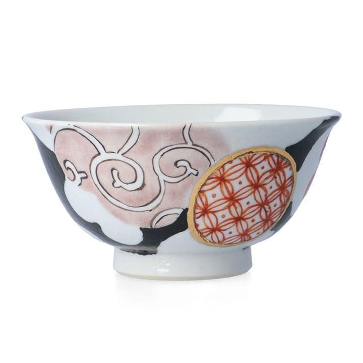 大胆な構図と色使いで、本作も印象的な仕上がりに。赤呉須で線描きされた花と、赤絵の丸紋も素敵です。
