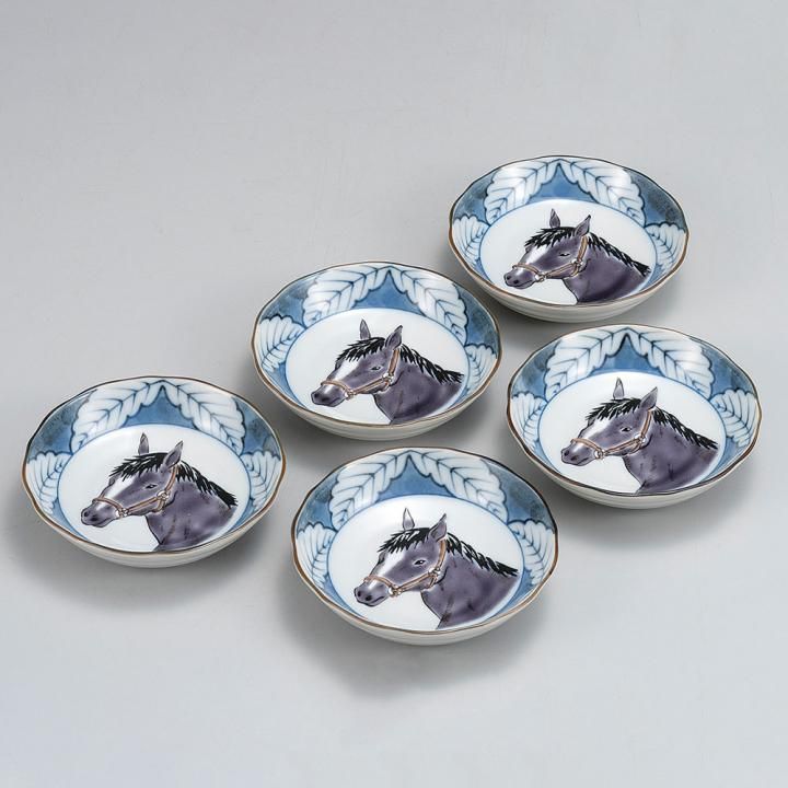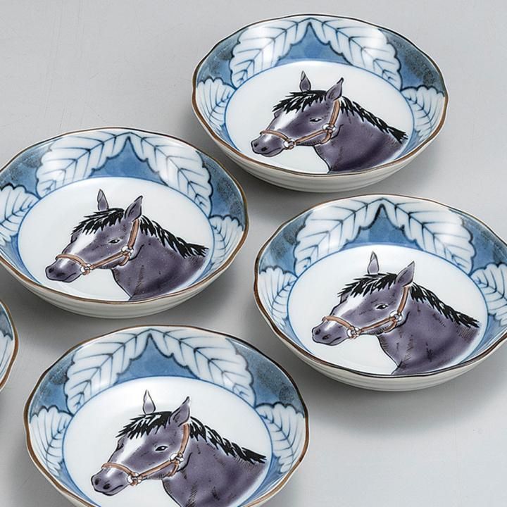優しい眼差しを向ける力強い馬を描いた皿揃。