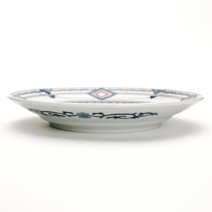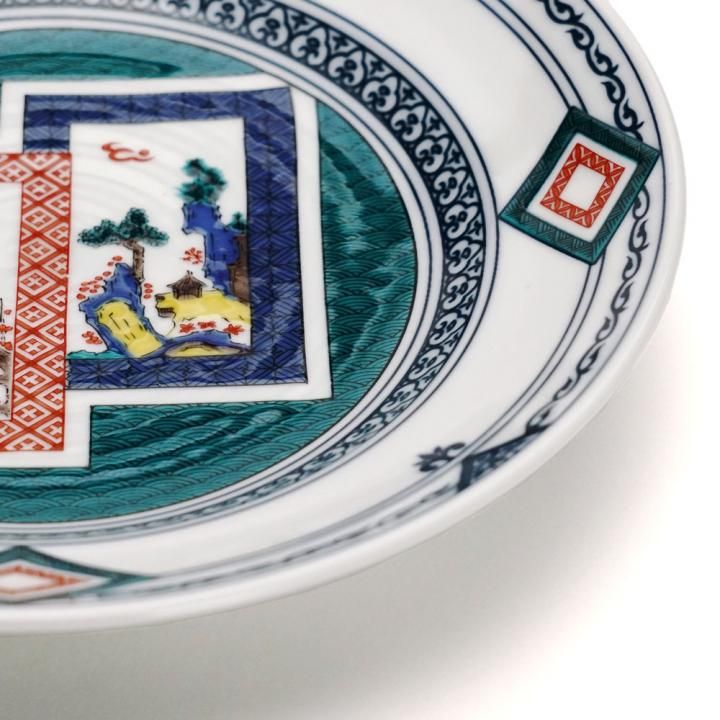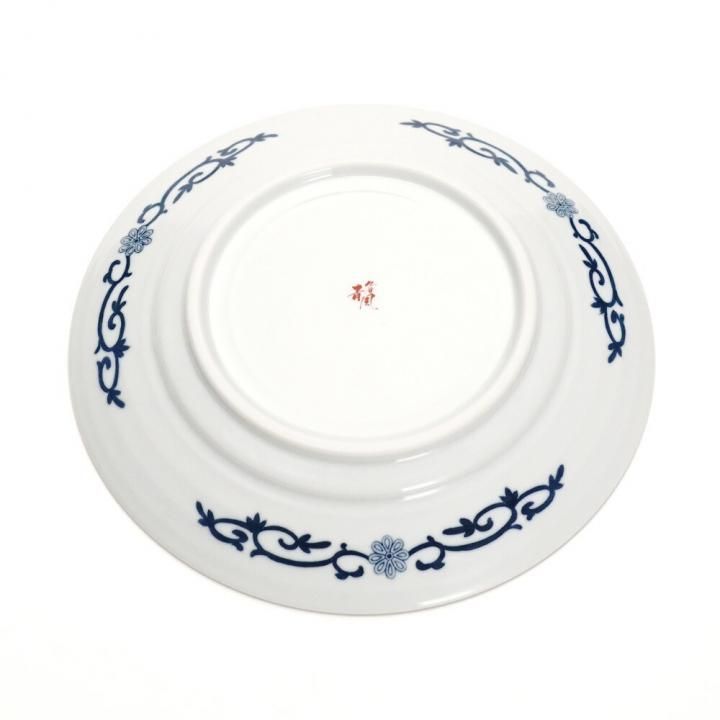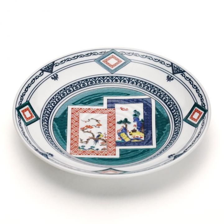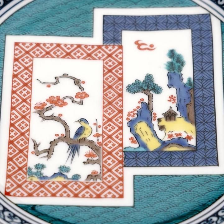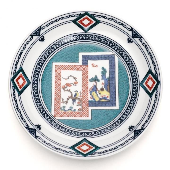 染付の文様と、古九谷風の優雅な色絵が調和した美しい8号皿です。中央には花鳥図が描かれ、伝統的な意匠の中にもモダンな印象を感じさせます。青郊窯ならではの上品な色使いと緻密な絵付けが、食卓を格調高く彩ります。
