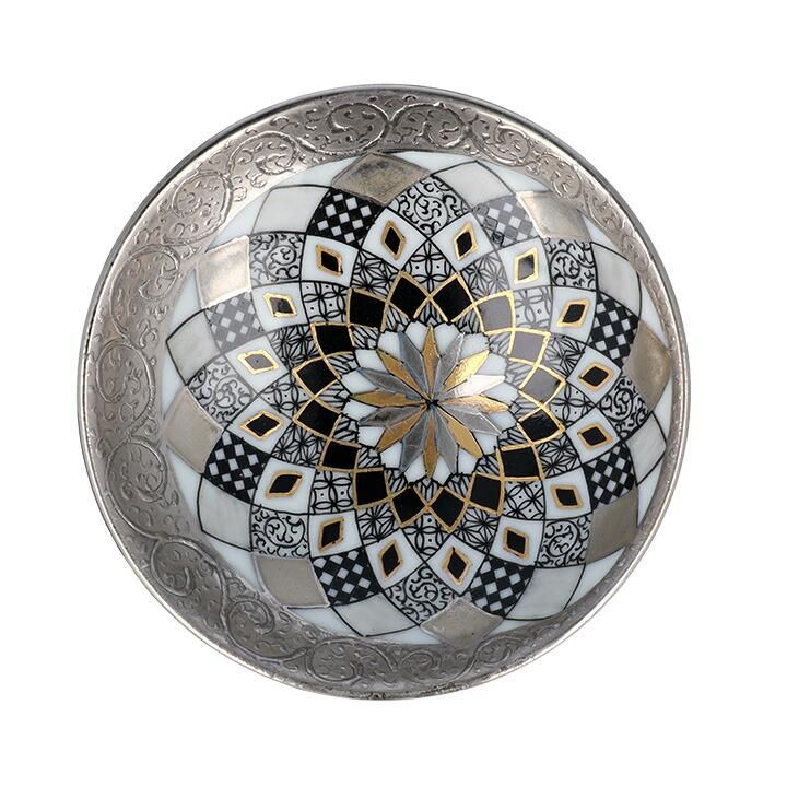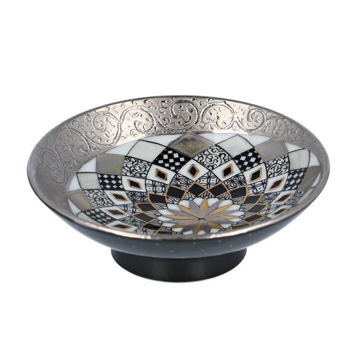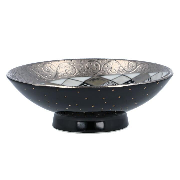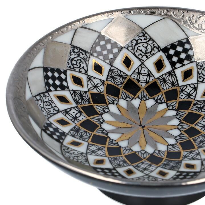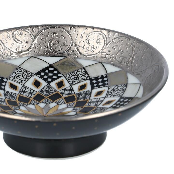 黒呉須(ごす)の極細の線で描かれた文様の連なり、ポイントにあしらわれたゴールドやシルバーの光沢感が効いていて、モダンでシック、それでいてインパクトのある作品です。