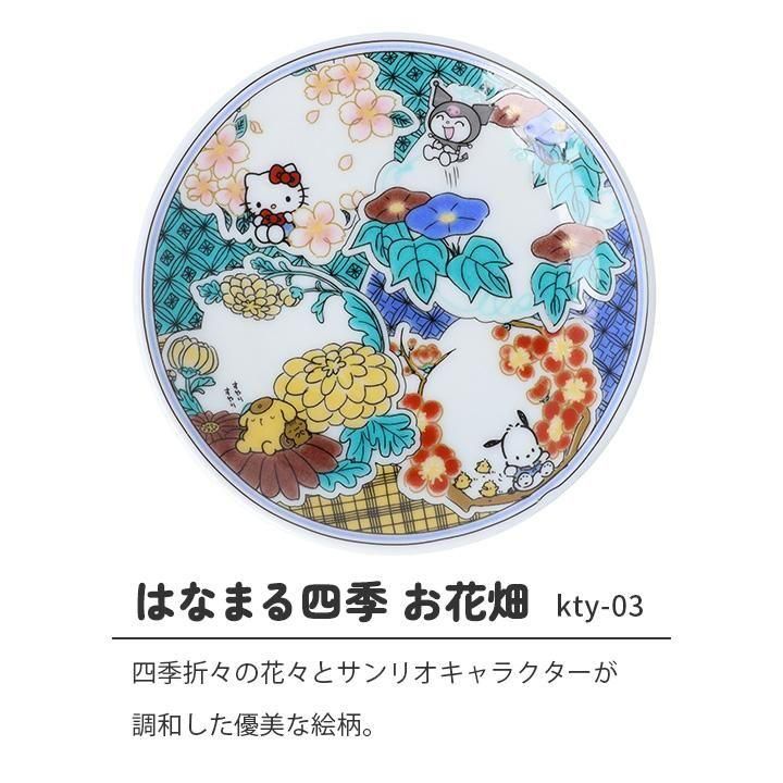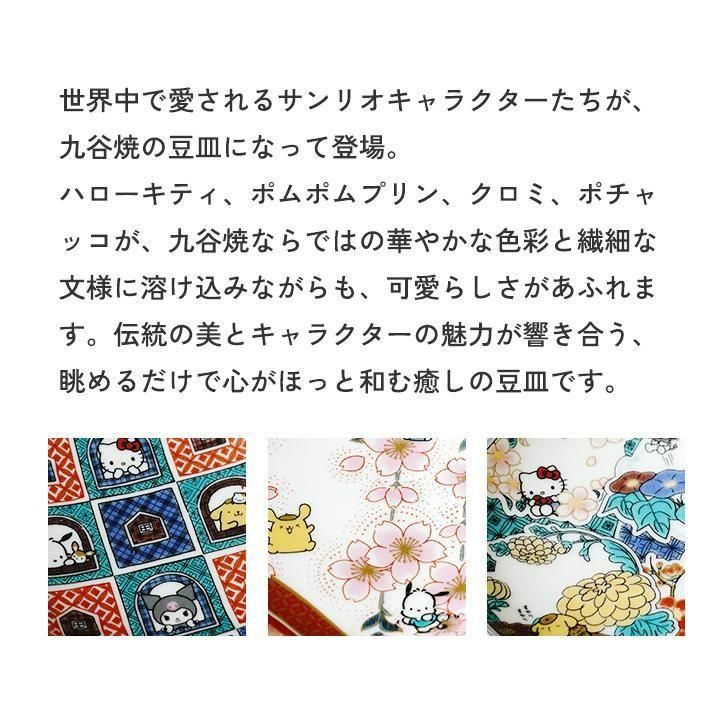 世界中で愛されるサンリオキャラクターたちが、九谷焼の豆皿になって登場。ハローキティ、ポムポムプリン、クロミ、ポチャッコが、それぞれの豆皿の中に愛らしく描かれています。伝統の美とキャラクターの魅力が響き合う、眺めるだけで心がほっと和む癒しの豆皿です。
