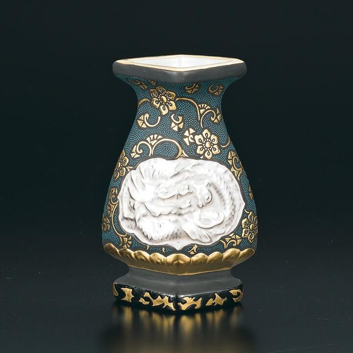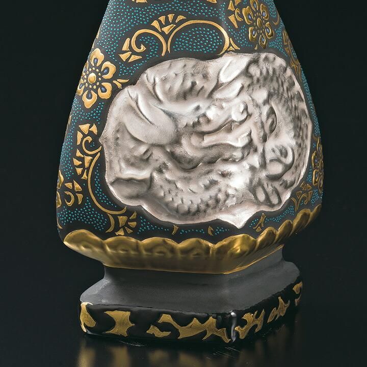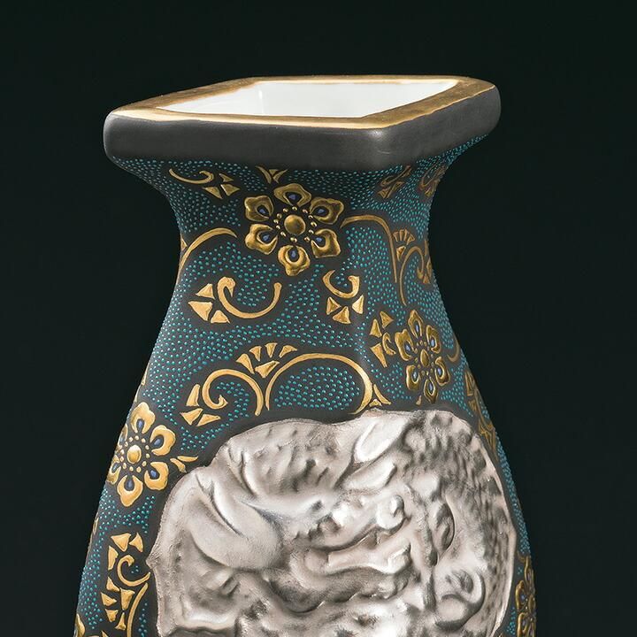 花入 盛金唐草文青粒龍鳳凰図 / 仲田錦玉 桐箱紐通し入り